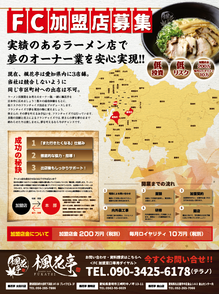 ZENITH株式会社では、楓花亭のフランチャイズ加盟店を募集しています。まずはお気軽に楓花亭太田川店までお問い合わせ下さい。 資料ダウンロードはコチラから